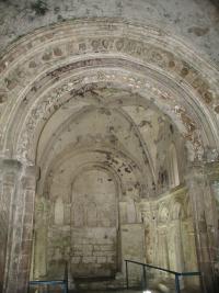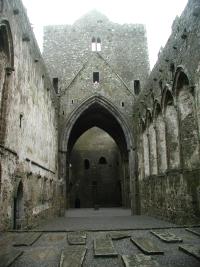 We had a lovely breakfast Tuesday morning with the English couple and two American women who apparently lived in Ireland. We talked quite a bit about the differences between American and English cultures, and tried to figure out why Americans think the English are so stuck up. All the Americans in the room agreed that we are embarrassed to come from a country that would elect an idiot like Bush and afraid of what he's going to do to the world, and the British people in the room agreed that we should be. We said fond farewells--with a hostess as friendly and gracious as Eileen, we will definitely stay here again next time we are in the area. Our plan for the day was to drive to the Dingle Peninsula. About a half hour along our way was a small town called Cashel. On the edge of the town, perched on a walled hill overlooking the town, is a pile of monastic ruins known as the Rock of Cashel, so we stopped to take a look. We took the back trail up to the rock, from which we had a lovely view of another nearby monastery. The first building we explored was St. Patrick's Church, a large Romanesque building. We admired the ribbed vaults, the gargoyles, and the nifty walkways inside the upper stories of the walls. They're doing a lot of restoration work on this part of the site, so we couldn't wander it quite as much.From there, we wandered around the graveyard. Most of the graves are relatively modern, but we had a marvelous view of the surrounding countryside just as a thick mist was beginning to settle on it. This monastery also has a round tower, much like the one at St. Kevin's. Attached to St. Patrick's Church at a funny angle is the 12th century Cormac's Chapel. It's a small building, but it's really nifty. The masonry is beautiful, and there are lots of carved decorations around the doorway, which have unfortunately deteriorated. Inside really felt like holy space. At the very back were the remnants of an elaborately carved sarcophagus. Along the sides of the sanctuary are columns with faces carved into their capitals. An arch separates the nave from the chancel--this arch has many round stones set into it with faces carved into them, many of which have deteriorated to have an almost African primitive look. The ceiling above the altar had been painted at one time. Little bits of paint still remain--just enough to give a tantalizing hint of the chapel's previous glory. We didn't spend long at the Rock of Cashel, but we enjoyed it. We set off into the mist and continued our drive to Dingle. We were taking back roads to get there (as if there were any other roads in Ireland), and the roads weren't quite doing what the map said they should be doing, so we weren't sure where we were. We passed an elderly couple walking down the road, so we stopped to ask them where we were. They were very kind and gave us very detailed directions, which they then went over many many times to make sure we understood. The problem with asking for directions in Ireland is that the roads don't really have names. The names of the roads aren't marked anywhere. Maps give them names like "R515," but locals just know the roads by what towns they lead to--"The Tralee Road" or "The Listowel Road." So getting directions can be tricky. But these people were very helpful. Once they were certain we knew where we were going, they wanted to know all about our trip and where we had been and where we were from, and we ended up in a big conversation about how much Bush is screwing things up and how messed up the world is. All the time we were talking, we were sitting on this narrow road, and every time a car passed by, the couple had to squish against our car to make room for the other car. They were darling little people, and it fun talking to them. |