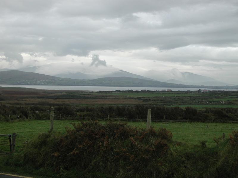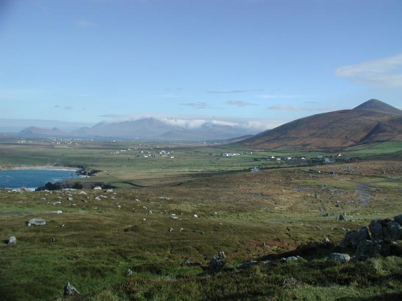 After that, the drive went faster than we thought it would, and we soon arrived on the Dingle Peninsula. The moment we went onto the peninsula, the scenery in all directions became breathtakingly gorgeous. To our right, we could see the quilted patchwork of the Slieve Mish Mountains, with a thick cap of rolling mist on top and lots of puffy white sheep everywhere. To our left was the coast, with beaches, cliffs, turbulent waters, and a distant view of rolling hills on the other side of the water. Sometimes the road was right on the edge of the cliffs. Soon, we arrived in the little town of Dingle. Our first goal was to find a place to stay, which quickly became very frustrating. After finding a few places with no vacancies and cursing at a phone card that wasn't working, I finally managed to get in touch with someone, and asked her if she had a room for two available. "Where are you parked?" she asked. I told her, and she said, "I'll be right down." Feeling very relieved, we stood next to a statue of Fungi, Dingle's dolphin celebrity (he moved into Dingle harbor in 1983 and has been playing with tourists ever since then), and waited. Soon a young lady on a bike rode up and introduced herself as Veronica. She was very friendly and silly. So we got in the car, and she led us to her B&B. She showed us to her room, then sat us next to the fire in her dining room for coffee (she had just run out of tea, which is too bad, because for all their skill with tea, the Irish really don't know how to make coffee). We were introduced to her husband Tom and toddler daughter Rachel. Veronica and Tom speak Gaelic, and they kept slipping back and forth between languages. Most of the Dingle Peninsula is the Gaeltacht--an area where Gaelic is the only official language. Many of the signs here are only in Gaelic. Rachel is a cute and cheerful child, but very noisy, so our conversation was constantly interrupted, but Veronica told us a lot about Dingle, how quickly the town is growing, some local sites we should be sure to see, and about some of the musicians in town. Dingle is full of artists and musicians--apparently they don't have to pay taxes. We finally set out onto the streets of Dingle. It was after 5:00, but a lot of the shops were still open, so we poked around the shops for a while. When we got hungry, we had tomato soup and chips at a pub. Then we went to a pub called the Small Bridge because they have live traditional Irish music every night. We got there long before the music started, and settled in for the evening next to the peat fireplace. We ended up being mostly surrounded by Americans--there was a middle-aged couple from Wisconsin and a group of American girls, one of whom has close enough relatives in Ireland to be eligible for dual citizenship. We talked to all of them about our journeys so far, commiserating about the hazards of Irish driving. Before long, the musicians arrived. We had the best seats in the house--right next to the cozy fireplace and about 10 feet away from the band, which consisted of an accordion, a banjo, and a guitar. A bodrhan player showed up later. The music was wonderful, the Guinness and Bailey's were tasty, and the company was great--we talked to lots of really nice people, Irish and otherwise. The pub has a nifty old-fashioned dark Irish pub feel to it. The American girls were really good at Irish dancing (a la Riverdance), and the musicans had fun playing good dancing music for them. At one point, the accordion player asked the girl who had danced the most where she was from, and everyone laughed when she said, "New York--sorry!" Thouroughly happy after a magically wonderful night, we found our way home and went to bed. |